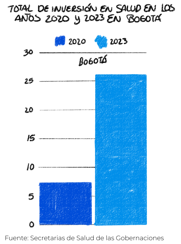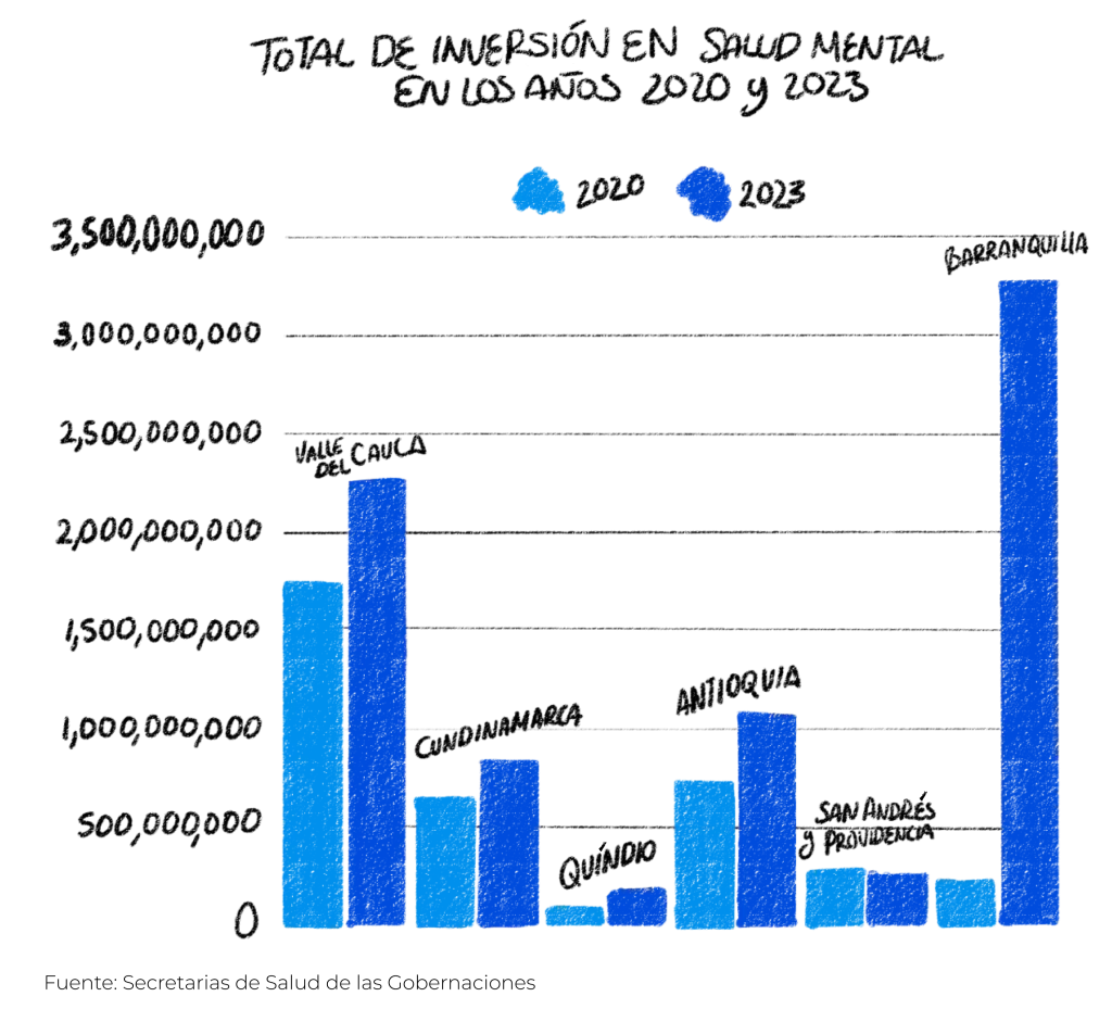 Una mirada a los presupuestos de cinco departamentos en los que esta investigación se concentra, revela que la inversión en salud mental ha aumentado significativamente después de la pandemia. En Bogotá, por ejemplo, se pasó de una asignación de 7 mil millones de pesos en el año 2020 a 26 mil millones de pesos en 2023; en el mismo periodo Antioquia pasó de 735 millones a mil millones de pesos.